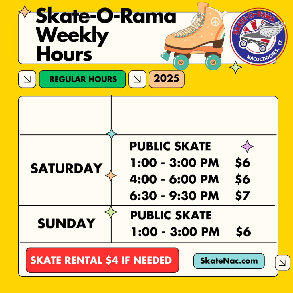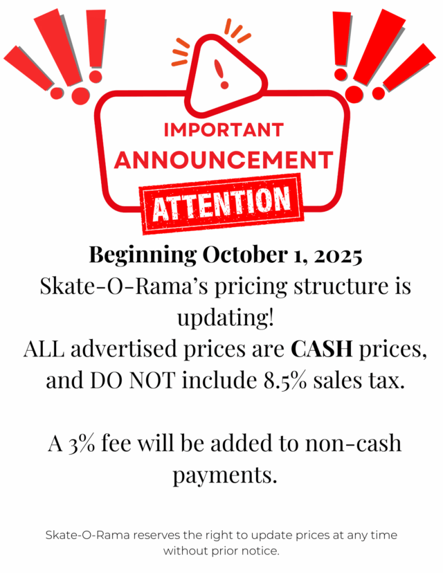 SATURDAY NIGHTS – anyone attending the 6:30 – 9:30 PM session, and NOT being accompanied by their parents 100% of the time, are required to WEAR skates at all times.
